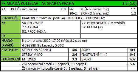 - Bilance posledních pěti zápasů s Mladou Boleslaví je pro Spartu mimořádně lichotivá: pět vítězství při skóre 11:2.