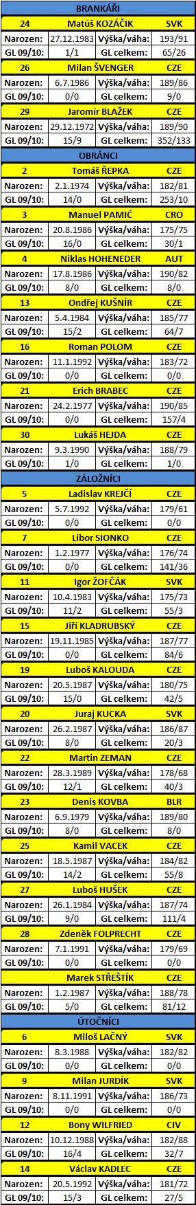 U hráčských statistik jsou uvedeny počty zápasů a gólů (u brankářů čistých kont).