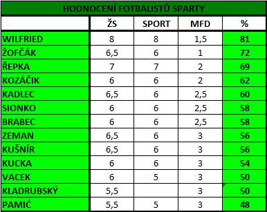 Sparta: Kozáčik 6 – Kušnír 6,5, Brabec 6, Řepka 7, Pamić 5,5 – Sionko 6 (57. Zeman 6,5), Vacek 6, Kucka 6 (60. Kladrubský 5,5), Žofčák 6,5 – Wilfried 8, Kadlec 6,5 (81. Třešňák).